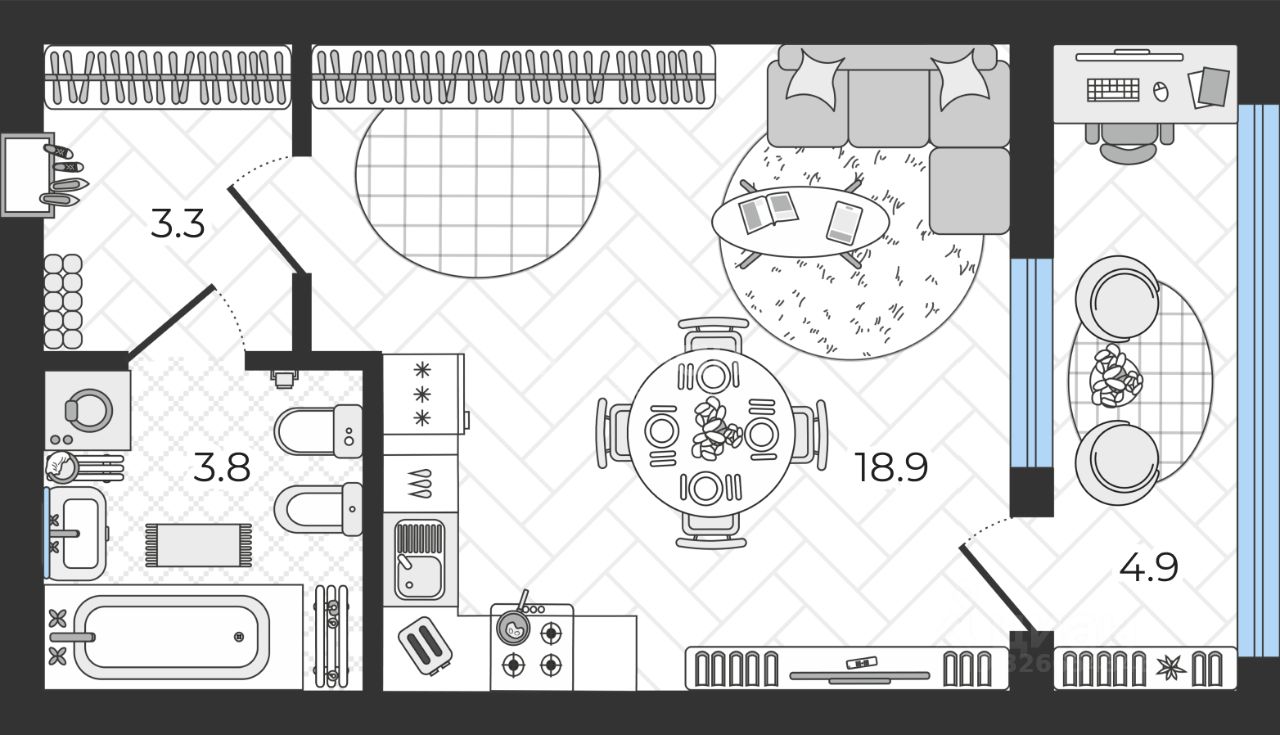 Из комнаты выход на ПРОСТОРНУЮ застекленную лоджию 4.9м2, это прекрасное место для работы или отдыха круглый год, если утеплить это пространство.