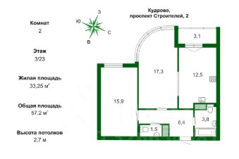 Общая площадь квартиры 57 м 2 без учёта лоджии.