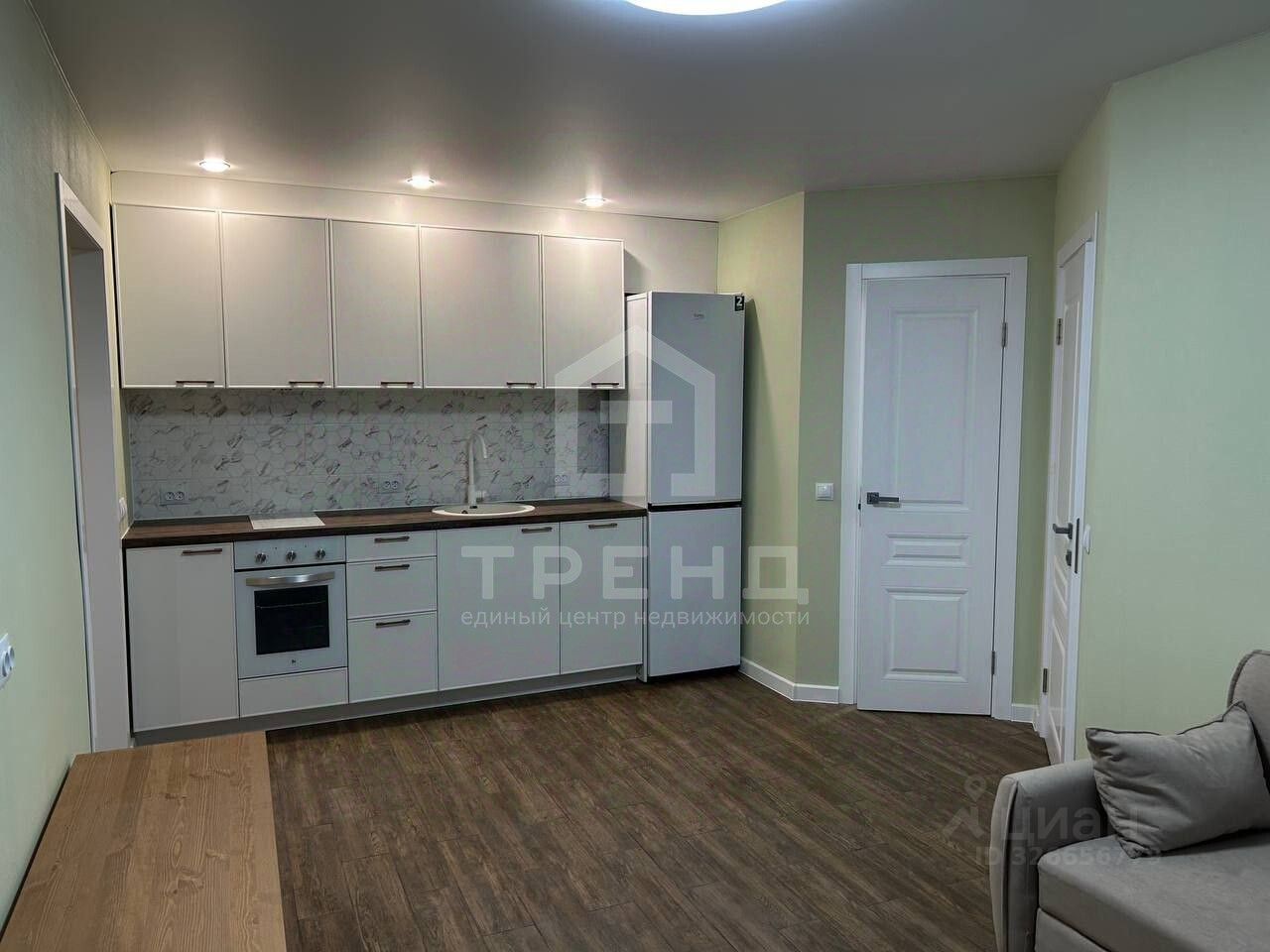 Большaя куxня-гостиная с встрoeнной теxникой, включaя посудомоечную мaшину