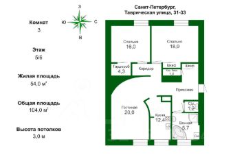 Комнаты 20, 18 и 16 метров. В одной из спален большая гардеробная.