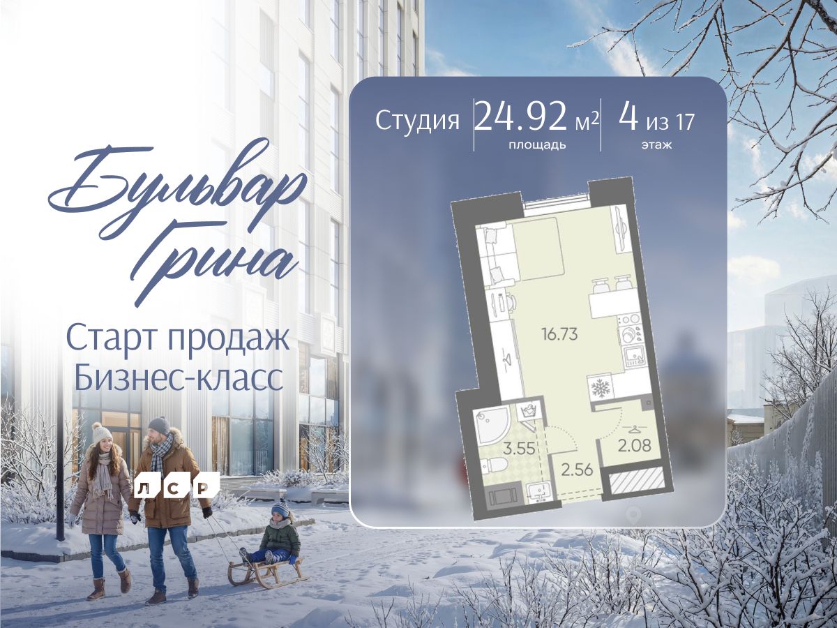 Продается студия в ЖК "Бульвар Грина" на 4 этаже. Общая площадь составляет 24.92 кв. м. Квартира с white box отделкой. Срок сдачи: 4-кв. 2028. Жилой комплекс "Бульвар Грина" располагается по адресу Санкт-Петербург, Василеостровский.