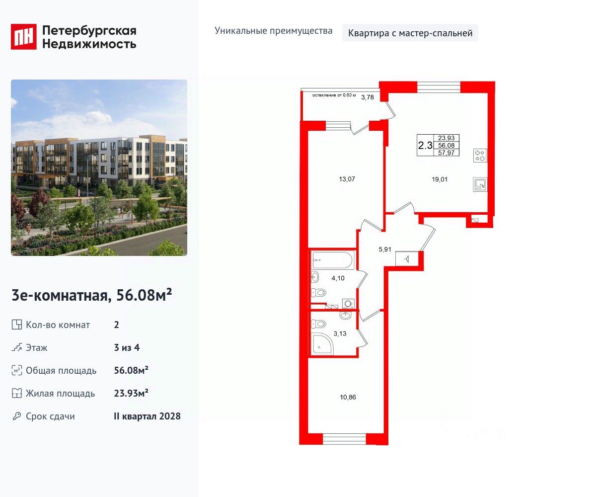 Уникальная, функциональная европланировка, большая кухня-гостиная 17.39 м², вместительная прихожая 6 м². Общая площадь квартиры - 56.08 м², жилая 23.93 м², высота потолка 2.77 м.