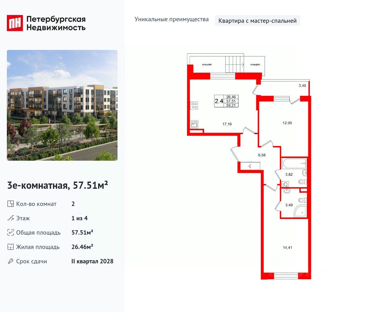 Уникальная, функциональная европланировка, большая кухня-гостиная 17.16 м², вместительная прихожая 6.58 м². Общая площадь квартиры - 57.51 м², жилая 26.46 м², высота потолка 2.77 м.