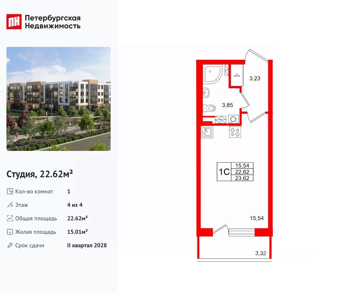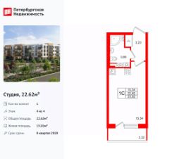 Удобная, классическая, функциональная европланировка, вместительная прихожая 3.08 м². Общая площадь студии - 22.62 м², жилая 15.01 м², высота потолка 3.07 м.