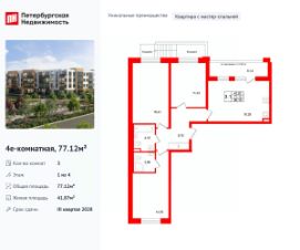Уникальная, функциональная европланировка, большая кухня-гостиная 18.28 м², вместительная прихожая 9.75 м². Общая площадь квартиры - 77.12 м², жилая 41.87 м², высота потолка 2.77 м.