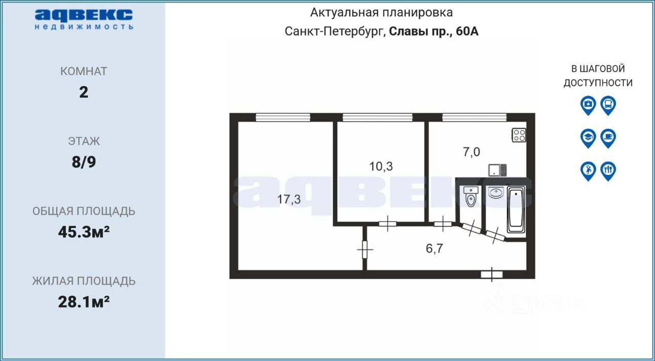 1. Идеальная транспортная доступность: 5-7 минут до станций метро Пр.Славы, Международная, Ломоносовская. Рядом остановки общественного транспорта, выезд на КАД.