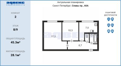 Вашему вниманию в прямой продаже 2-к квартира площадью 45.3м2 на Гамбургской площади.