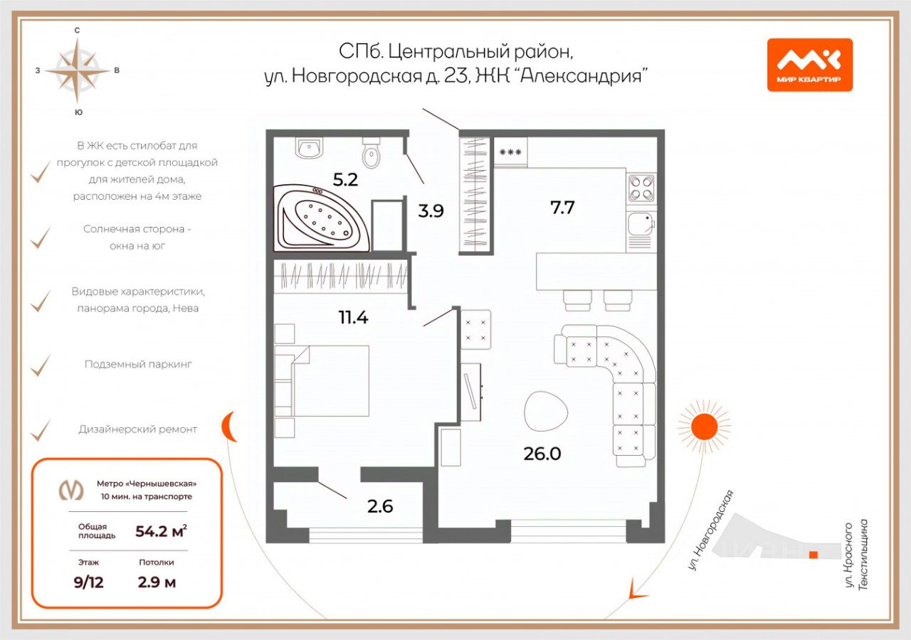 Эргономичная планировка включает в себя просторную кухню с гостиной, изолированную спальню и совмещенный санузел. Из окон открывается вид на тихий двор и на Неву, а наличие лоджии добавляет еще больше пространства и света.