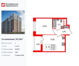 Удобная, классическая, функциональная европланировка, большая кухня-гостиная 13.08 м², вместительная прихожая 3.39 м². Общая площадь квартиры - 30.18 м², жилая 10 м², высота потолка 2.77 м.