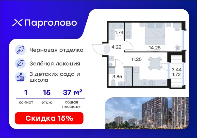 Продается 1-комн. квартира на 15-м этаже в проекте комфорт-класса Парголово. Общая площадь лота составляет 37,06 кв. м, из которых 14,28 кв. м отведено под жилую и 11,25 кв. м под кухонную зону. Номер квартиры - 140.