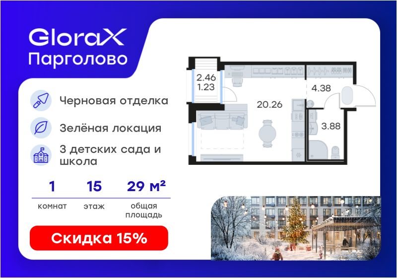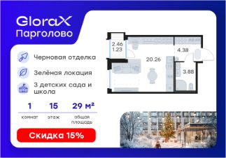 Продается квартира-студия на 15-м этаже в проекте комфорт-класса GloraX Парголово. Общая площадь лота составляет 29,75 кв. м, из которых 20,26 кв. м отведено под жилую и кв. м под кухонную зону. Номер квартиры - 134.