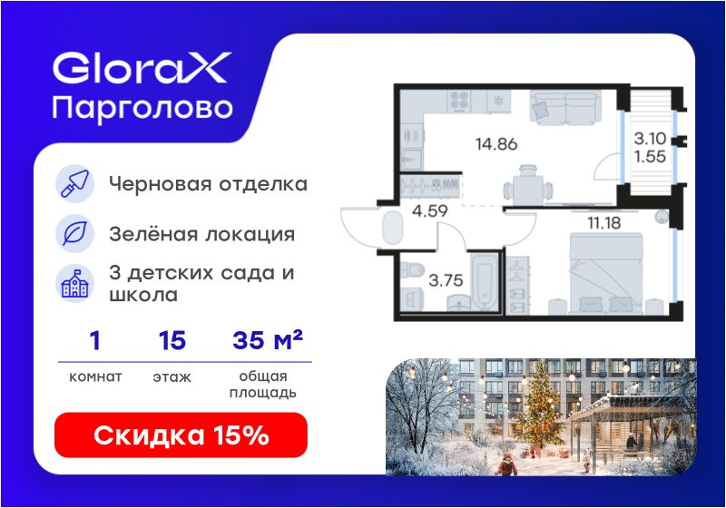 Продается 1-комн. квартира на 15-м этаже в проекте комфорт-класса GloraX Парголово. Общая площадь лота составляет 35,93 кв. м, из которых 11,18 кв. м отведено под жилую и 14,86 кв. м под кухонную зону. Номер квартиры - 280.
