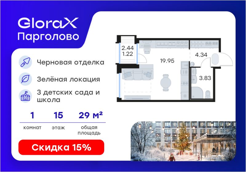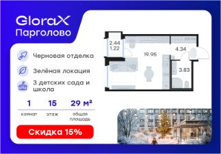 Продается квартира-студия на 15-м этаже в проекте комфорт-класса GloraX Парголово. Общая площадь лота составляет 29,34 кв. м, из которых 19,95 кв. м отведено под жилую и кв. м под кухонную зону. Номер квартиры - 140.