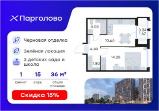 Продается 1-комн. квартира на 15-м этаже в проекте комфорт-класса Парголово. Общая площадь лота составляет 36,93 кв. м, из которых 14,28 кв. м отведено под жилую и 10,66 кв. м под кухонную зону. Номер квартиры - 268.