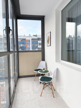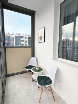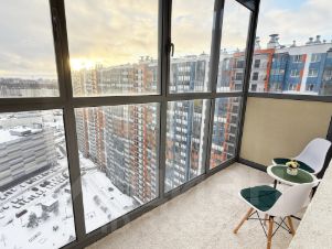У квартиры увеличенный балкон - 5,7м с большими панорамными окнами в пол и прямым видом на город (вдалеке даже виден купол и колоннада Исаакиевского собора), также видно 2 флага в парке 300-летия Петербурга. Ночью город очень красиво подсвечен, что создаёт потрясающую атмосферу.