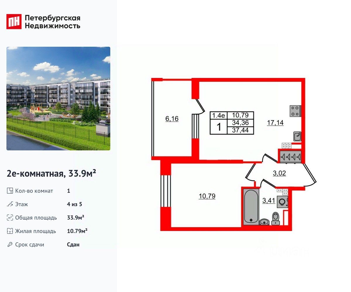 Удобная, классическая, функциональная европланировка, большая кухня-гостиная 17.14 м², вместительная прихожая 3.02 м². Общая площадь квартиры - 33.9 м², жилая 10.79 м².