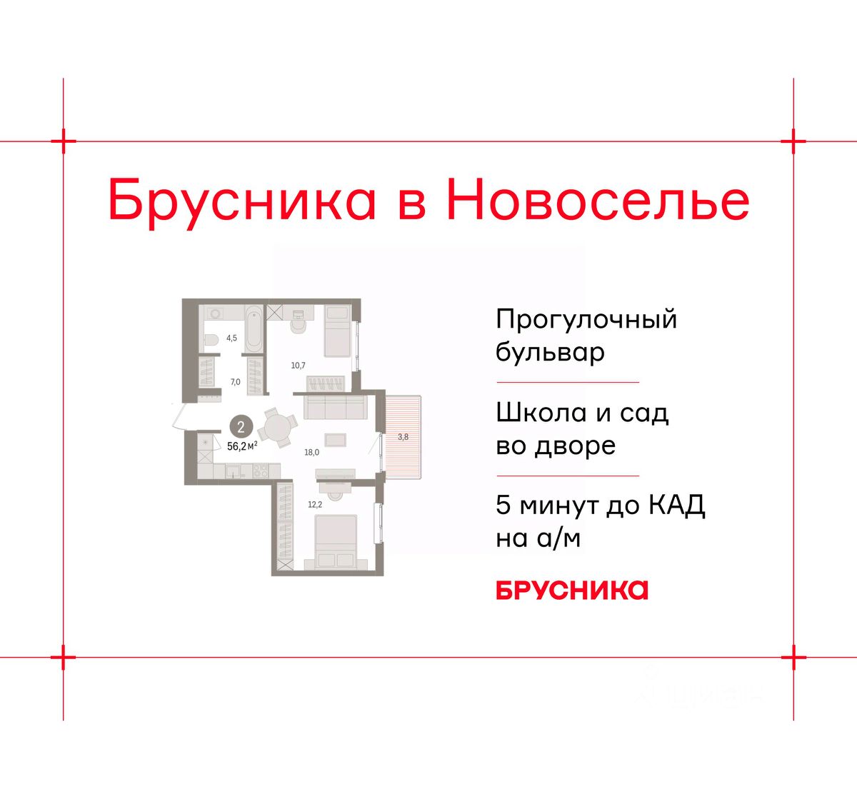 Просторная 2-комн. квартира с предчистовой отделкой в ЖК "Брусника в Новоселье" на 6 этаже. Общая площадь: 56.15 кв.м., жилая: 22.9 кв.м., площадь просторной кухни-столовой: 18 кв.м. Комнаты изолированные, все окна выходят на одну сторону. В квартире один балкон, один совмещенный санузел. Высота потолков 2.7 м.