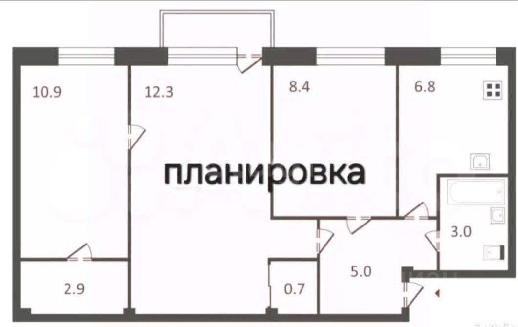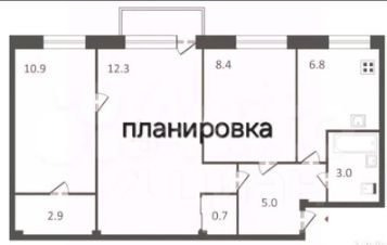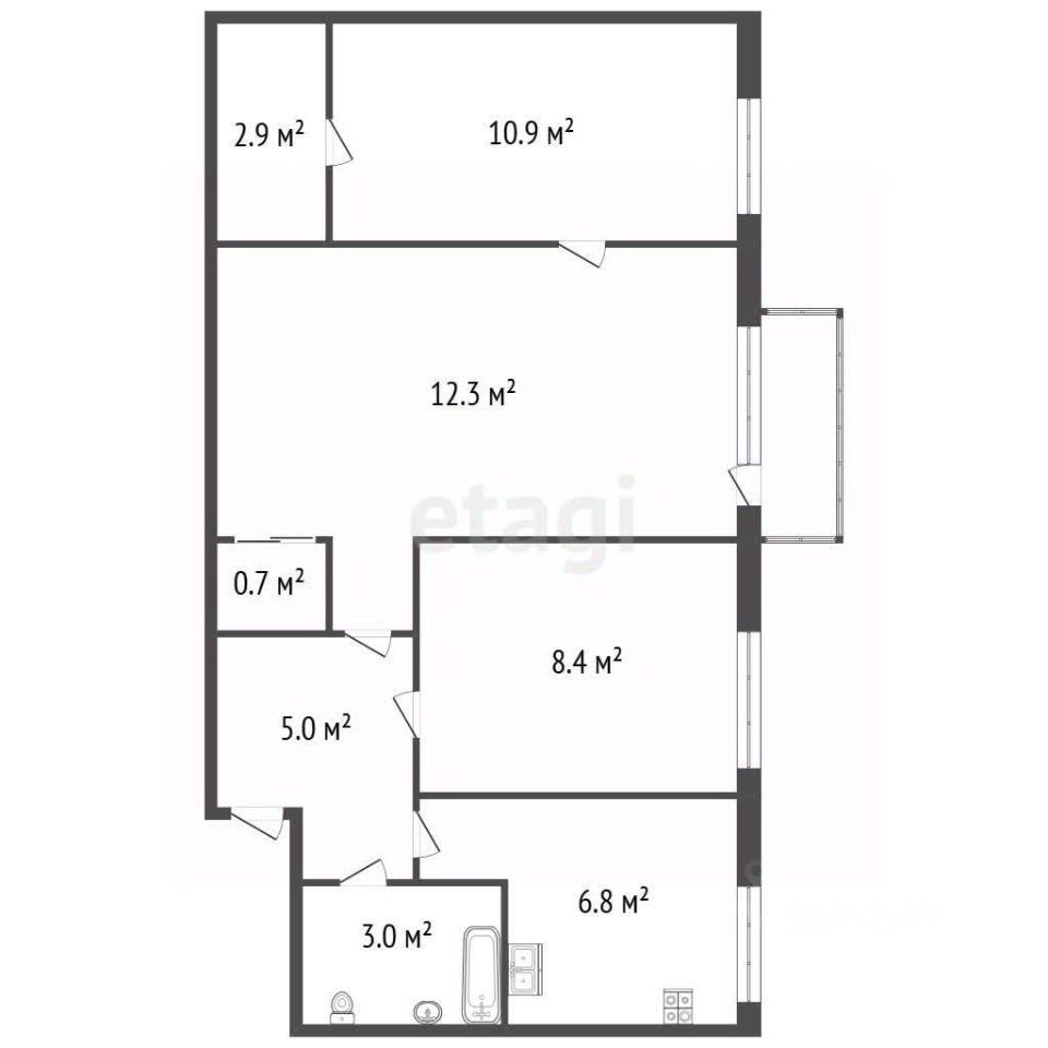Комнаты: большая гостиная (12,3 кв.м), комнаты (10,9 кв.м и 8,4 кв.м), кухня (6,8 кв.м).Дополнительно: коридор (5,0 кв.м), гардеробная (0,7 кв.м), совмещенный санузел.