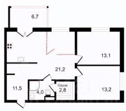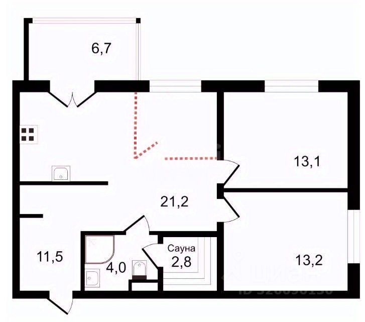 Свобода выбора: Возможна гибкая планировка: гостиную можно легко разделить (в план заложена возможность), получив третью комнату — отличный вариант для кабинета или детской (обозначено красным пунктиром на плане).