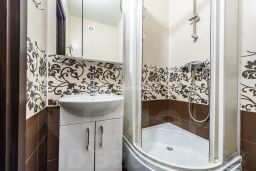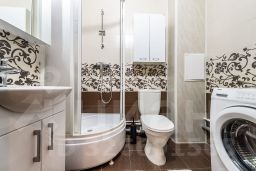 Душевая кабина, раковина с тумбой, зеркало, унитаз, стиральная машина, шкафчики для хранения.