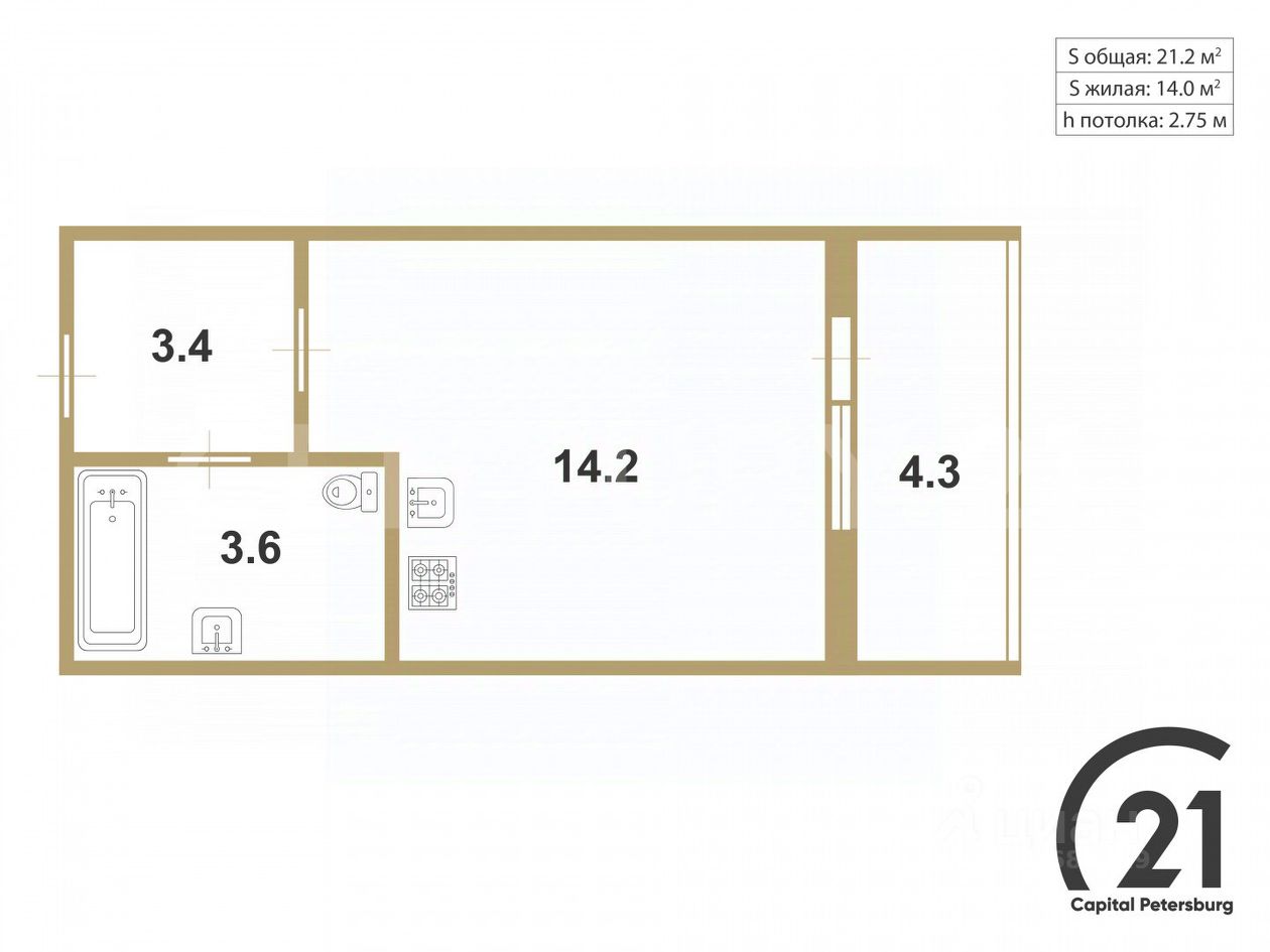 Площадь: 21,2 м² - по выписке из ЕГРН, БЕЗ учёта лоджии!