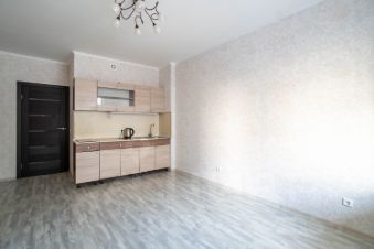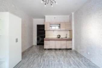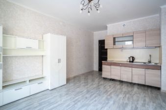 Светлая студия 23,8 м² полностью готова к проживанию, Установлена функциональная кухня с варочной панелью, стенка-горка для личных вещей и вместительный шкаф в коридоре с вешалкой для уличной одежды.