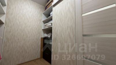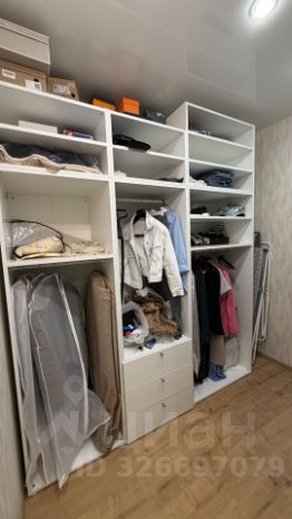 Сверхудобная гардеробная (4.9 кв. м) оборудована стеллажами и отсеками.
