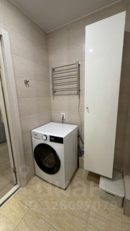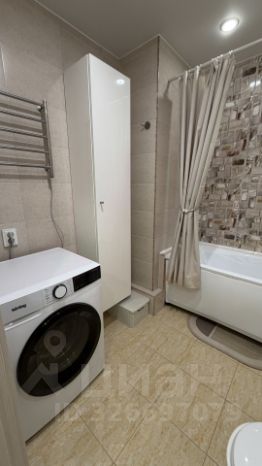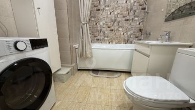 Совмещённый санузел укомплектован полноценной ванной, качественными унитазом и раковиной с технологичными смесителями, шкафами и стиральной машиной с фронтальной загрузкой на 7 кг, электрическим полотенцесушителем.