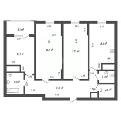 - Количество комнат: 3 изолированных комнаты площадью 11.1, 16.7 и 17.5 кв.м соответственно
