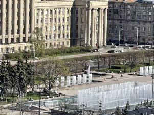 • Вид на Московский проспект, Чесменскую церковь, Храм Рождества св.Иоанна Предтечи, площадь с фонтанами, сквер, парк Победы.