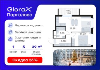 Продается 1-комн. квартира на 5-м этаже в проекте комфорт-класса GloraX Парголово. Общая площадь лота составляет 39,99 кв. м, из которых 10,42 кв. м отведено под жилую и 17,89 кв. м под кухонную зону. Номер квартиры - 45.