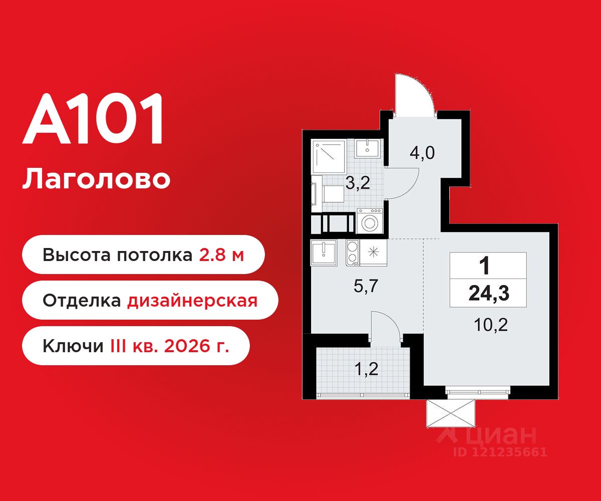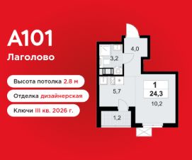 Студия площадью 24.30 в ЖК "А101 Лаголово" c лоджией на 9 этаже. Квартира с отделкой. Вид из окна на улицу. В квартире 1 санузел. Высота потолков 2.8 м.