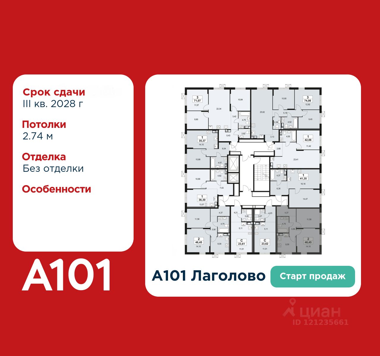 2-комнатная квартира площадью 46.45 в ЖК "А101 Лаголово" на 3 этаже. Квартира без отделки. Вид из окна на улицу. В квартире 1 санузел. Высота потолков 2.84 м.
