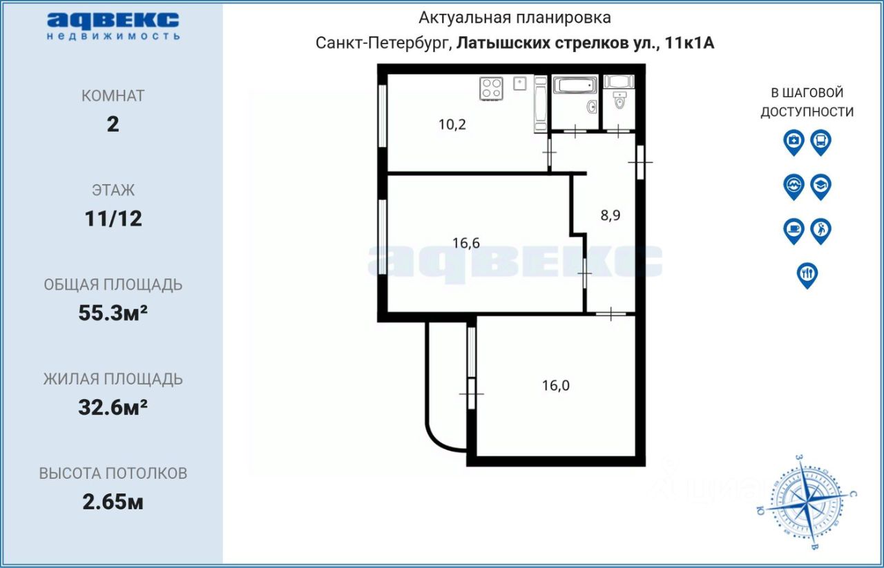 Площадь квартиры 55,3 м кв. Жилая 32,6/ кухня 10,2), 11 из 12 этажей.