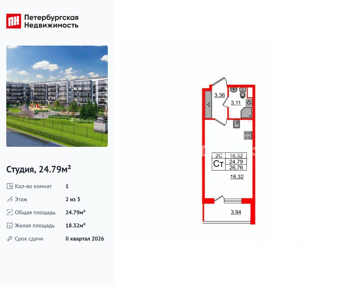 Удобная, классическая, функциональная европланировка, просторная прихожая 3.36 м². Общая площадь студии - 24.79 м², жилая 18.32 м², высота потолка 2.77 м.