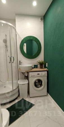Современный санузел совмещенный, оборудован душевой кабиной, унитазом и стиральной машиной.