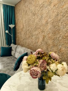Все стены выполнены дорогой красивой декоративной штукатуркой. Стены не только красивые, но и антивандальные, что позволяет спокойно заводить домашних питомцев и не переживать за ремонт.