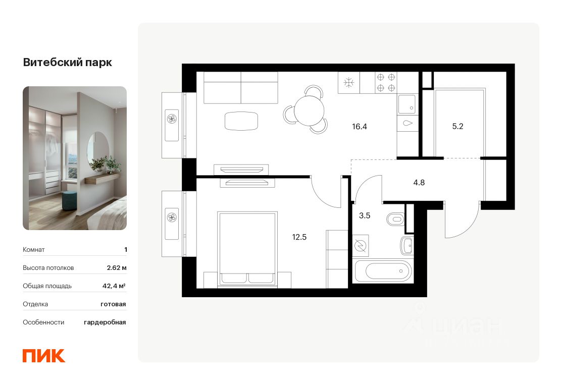Продаётся 1-комн. квартира площадью 42,4 кв.м на 1 этаже 12 этажного дома (Корпус 6, Секция 1) проекта ПИК Витебский парк. Светлый просторный подъезд на уровне земли, функциональная планировка, большие окна, предчистовая отделка.