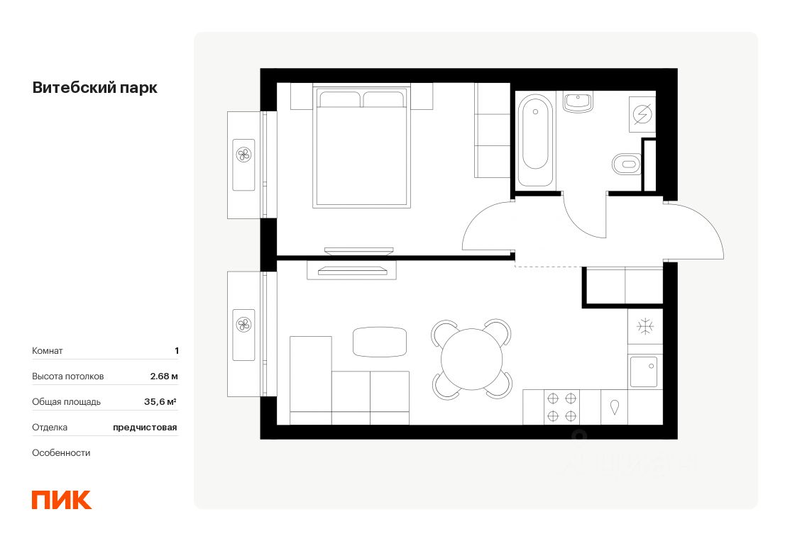 Продаётся 1-комн. квартира площадью 35,6 кв.м на 12 этаже 12 этажного дома (Корпус 6, Секция 3) проекта ПИК Витебский парк. Светлый просторный подъезд на уровне земли, функциональная планировка, большие окна, c отделкой.