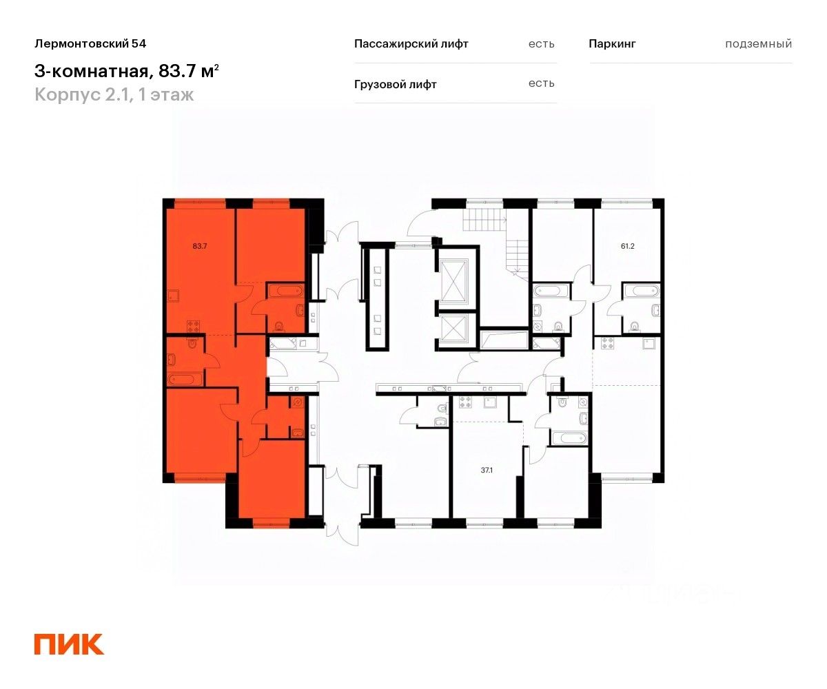Продаётся 3-комн. квартира площадью 83,7 кв.м на 1 этаже 9 этажного дома (Корпус 2.1, Секция 4) проекта ПИК Лермонтовский 54. Светлый просторный подъезд на уровне земли, функциональная планировка, большие окна, без отделки.