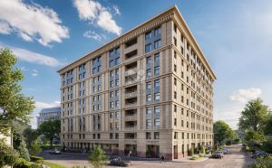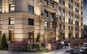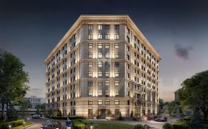 Проект выполнен знаменитой архитектурной мастерской Цыцына. При создании здания применяются навесные фасады из фиброцементных фактурных панелей, выполненных в спокойных пастельных тонах. Парадный фасад визуально разделен на 3 уровня. Первые этажи выделены крупным рустом, с 3 этажа панели облицованы искусственным камнем травертин, спаренными пилястрами и зеркальными окнами, а 10 этаж венчает массивный карниз. Входная группа выделена элегантным трехэтажным порталом, а светлые окна первых этажей выполнены в пол. В вечернее и ночное время реализована архитектурная подсветка.