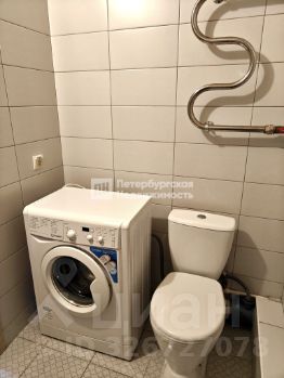 Совмещённый санузел в светлых тонах с ванной и установленной стиральной машиной.