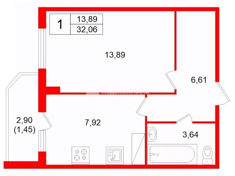 - Кухня имеет выход на застеклённую лоджию (площадь квартиры в объявлении указана без учёта лоджии (+ 2,9 м2)).