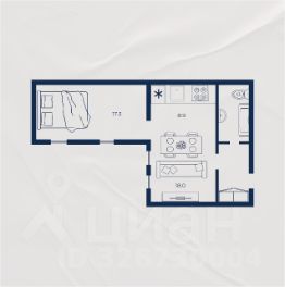 Общая площадь 55.2 м2. Спальня 17.3 м2, кухня-гостиная 27 м2 (зона кухни 9 м2 и 18 м2 гостиная).