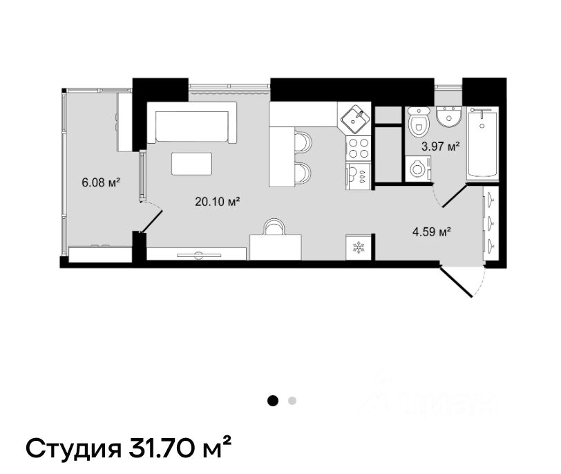 В продаже уникальная студия с дополнительным окном в центре комнаты.