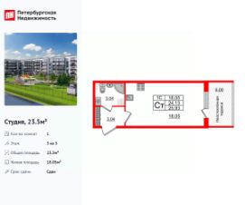 Удобная, классическая, функциональная европланировка, вместительная прихожая 3.04 м². Общая площадь студии - 23.5 м², жилая 18.05 м², высота потолка 3.07 м.