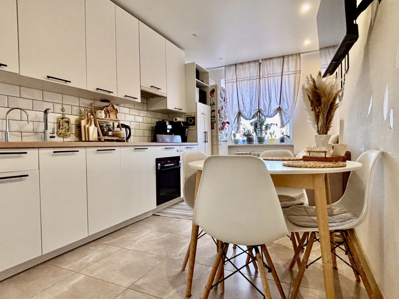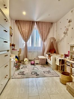В квартире выполнена умная перепланировка: Расширенная кухня-гостиная за счет переноса проема и просторная светлая детская, созданная путем объединения помещений. Отсутствуют узкие коридоры. Сделан качественный ремонт и комфорт: Полная замена сантехники, радиаторов, скрытые в утепленных фальшстенах коммуникации (повышенная шумоизоляция и тепло). Во всех комнатах — натяжные потолки, ламинат Tarkett или керамогранит.