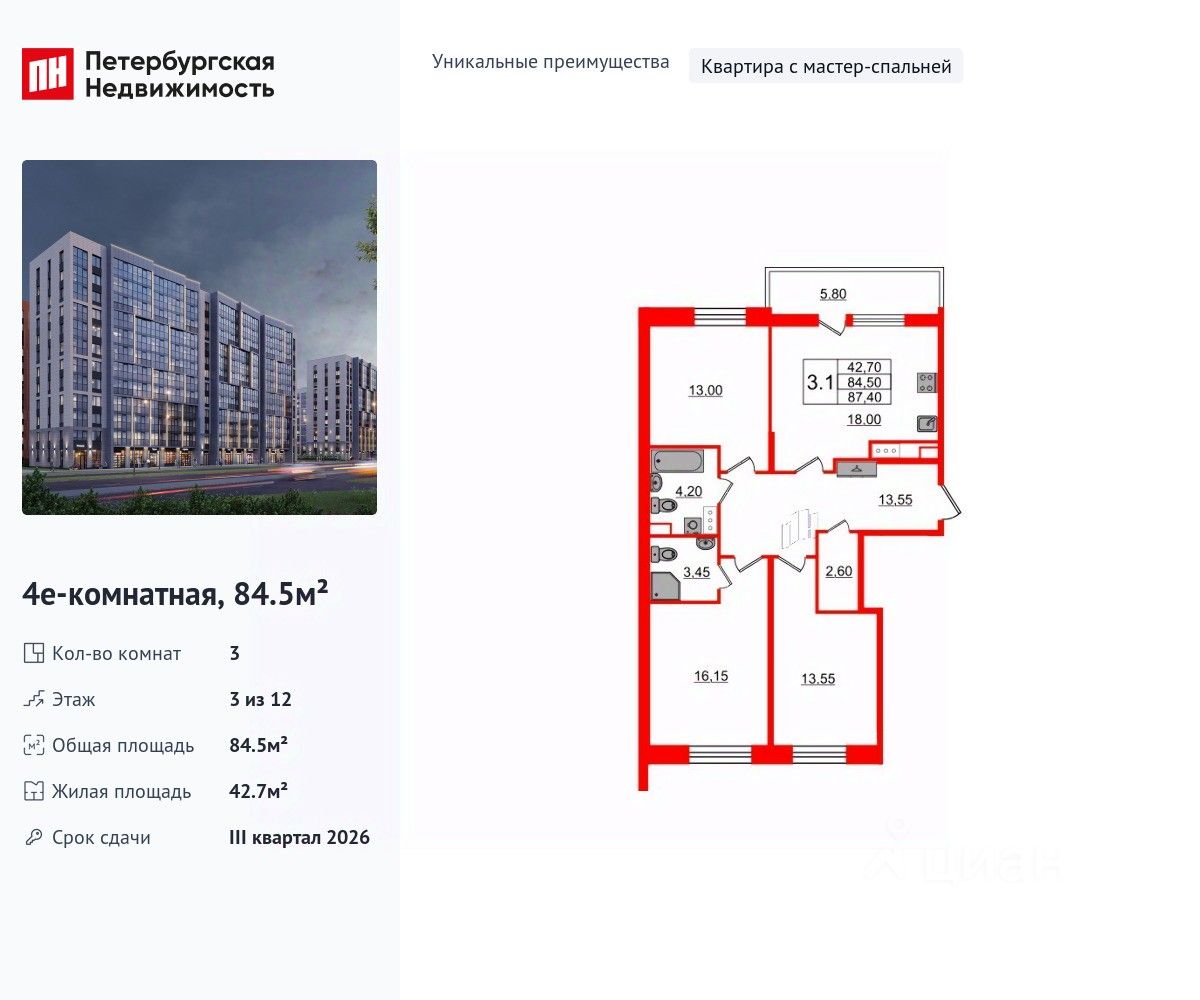 Уникальная, функциональная европланировка, большая кухня-гостиная 18 м², просторная прихожая 13.55 м². Общая площадь квартиры - 84.5 м², жилая 42.7 м², высота потолка 2.77 м.