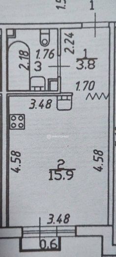 Просторный совмещенный санузел 3.8 м2 оборудован полноценной ванной.