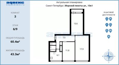 + Три изолированные комнаты: 13.6 (с застекленный лоджией)+17,9+11,8 м.